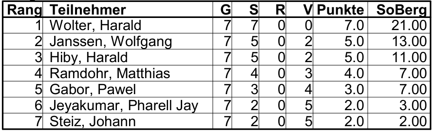 Am 15.01. wurde die erste Runde der Blitzschach-VM ausgetragen. Insgesamt nahmen sieben Spieler daran teil.