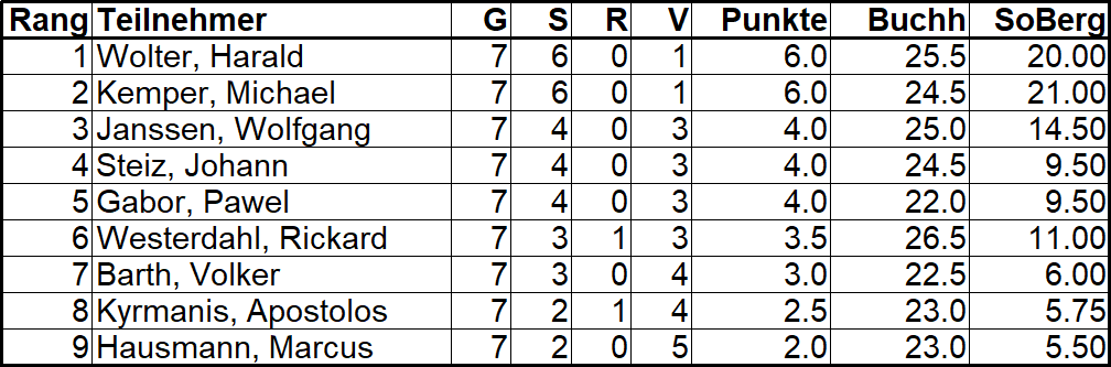 In der nachfolgenden Diskussion wurden die organisatorischen Schwierigkeiten einer Neuansetzung (Terminfindung, erneute Teilnahme aller Spieler, mögliche Teilnahme neuer Spieler und damit verbundene Abgrenzungsfragen) der Tatsache gegenübergestellt, dass sieben gespielte Partien eine ausreichende Grundlage für eine Wertung darstellen.