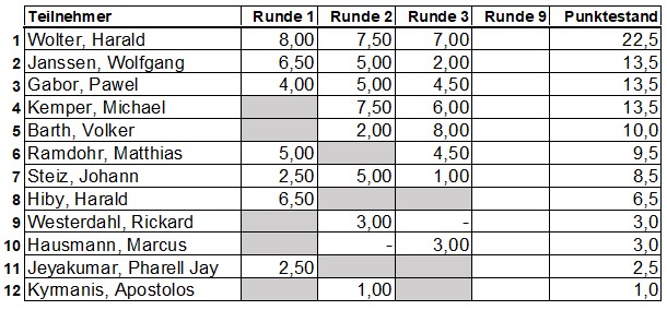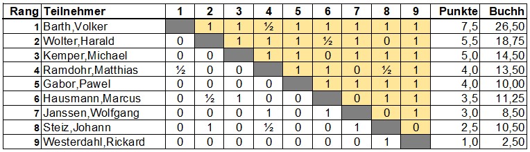 Wir freuen uns über den überraschend klaren Sieg von Volker, der sich mit 7,5 Punkten einen Vorsprung von zwei Punkten auf den zweiten Platz erspielen konnte.