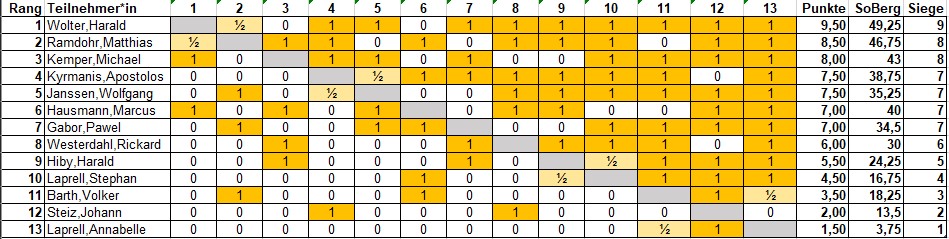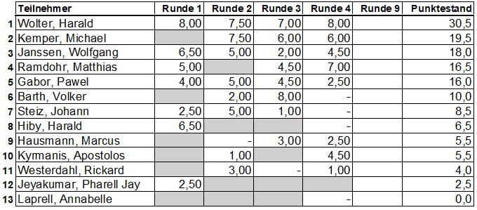 Am Ende setzte sich Harald Wolter mit 9,5 Punkten an die Spitze des Feldes und sicherte sich den Rundensieg. Dahinter belegte Matthias mit 8,5 Punkten den zweiten Platz. Rang drei ging an Michael, der 8 Punkte erzielte.