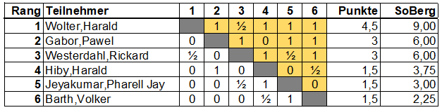 Gewinner des Turniers ist Harald Wolter mit 4,5 Punkten. Den zweiten Platz teilen sich Pawel und Rick. Da der dritte Platz von Harald Hiby, PJ und Volker geteilt wurde, konnte an diesem Tag jeder Teilnehmer einmal das Podium besteigen.