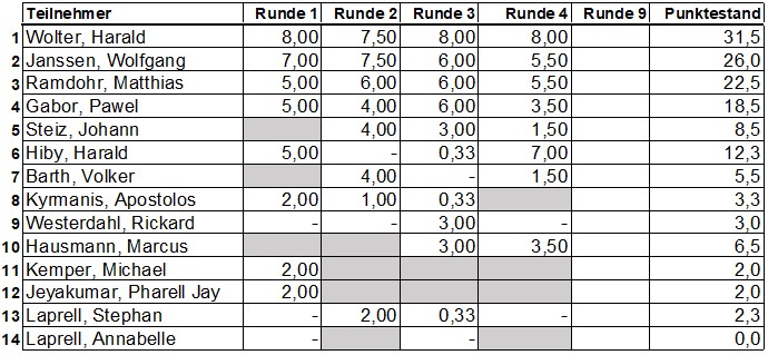 Am 16.04. fand die vierte Runde unseres Schnellschachturniers statt. Mit zehn Teilnehmer*innen war das Turnier erneut gut besucht.